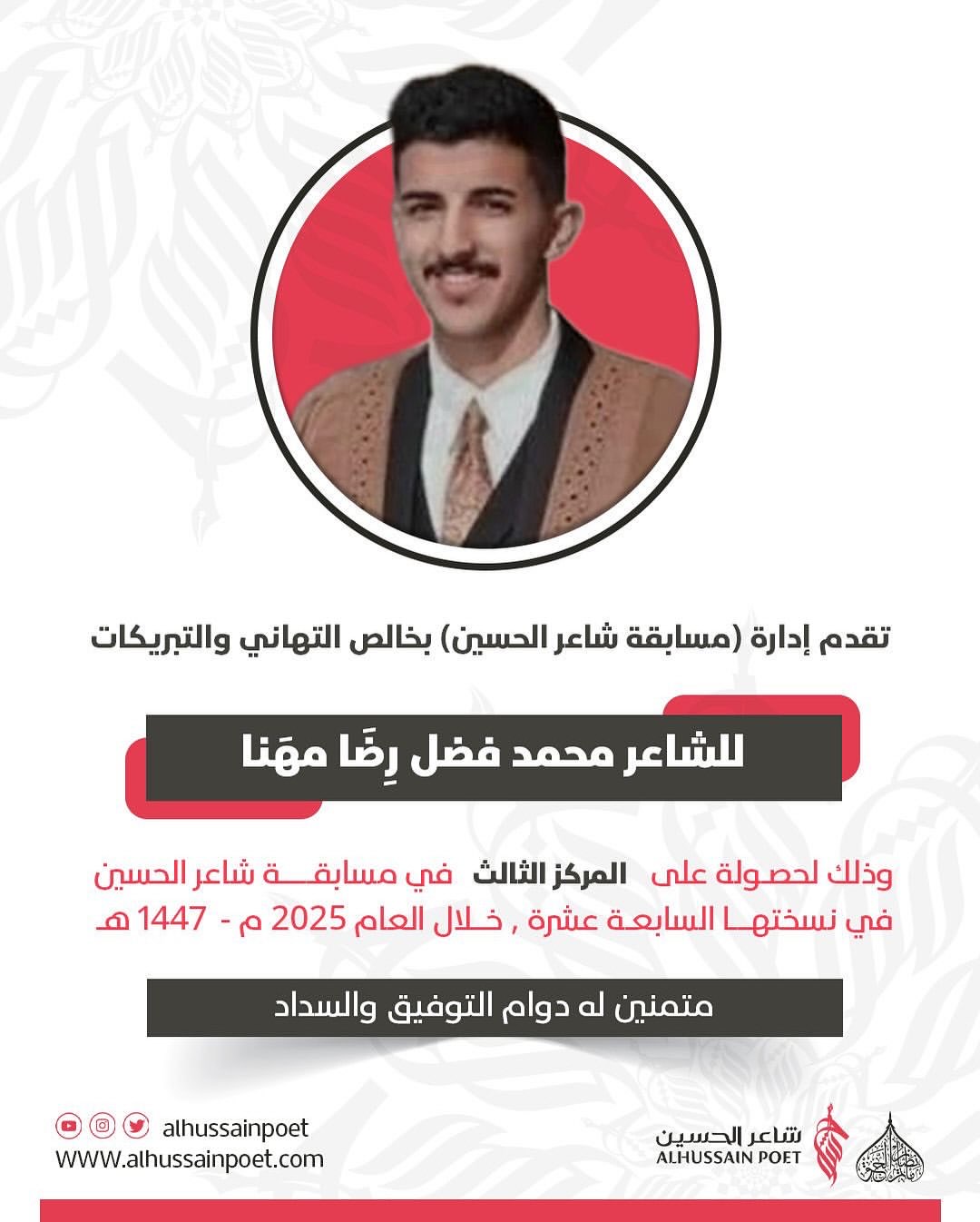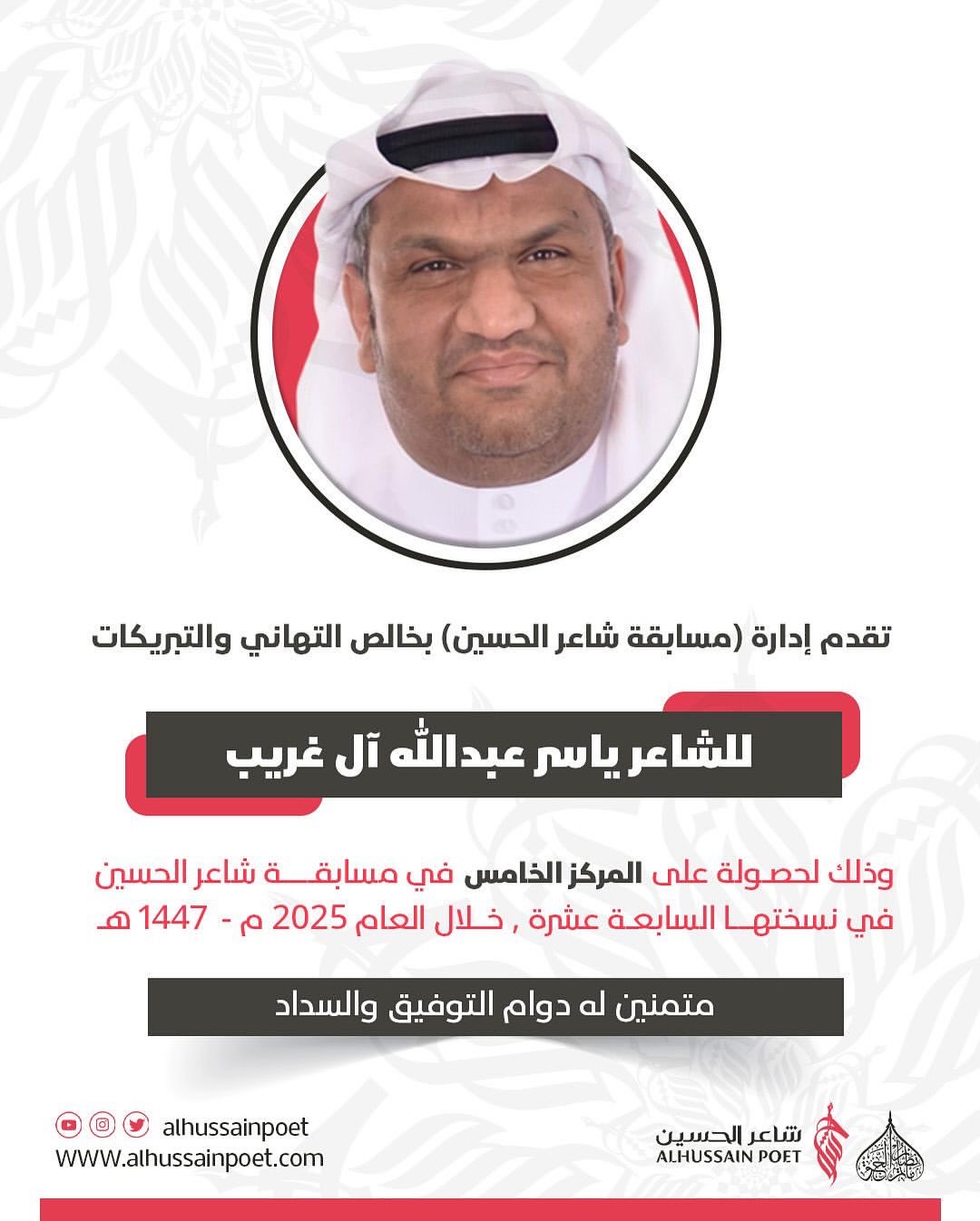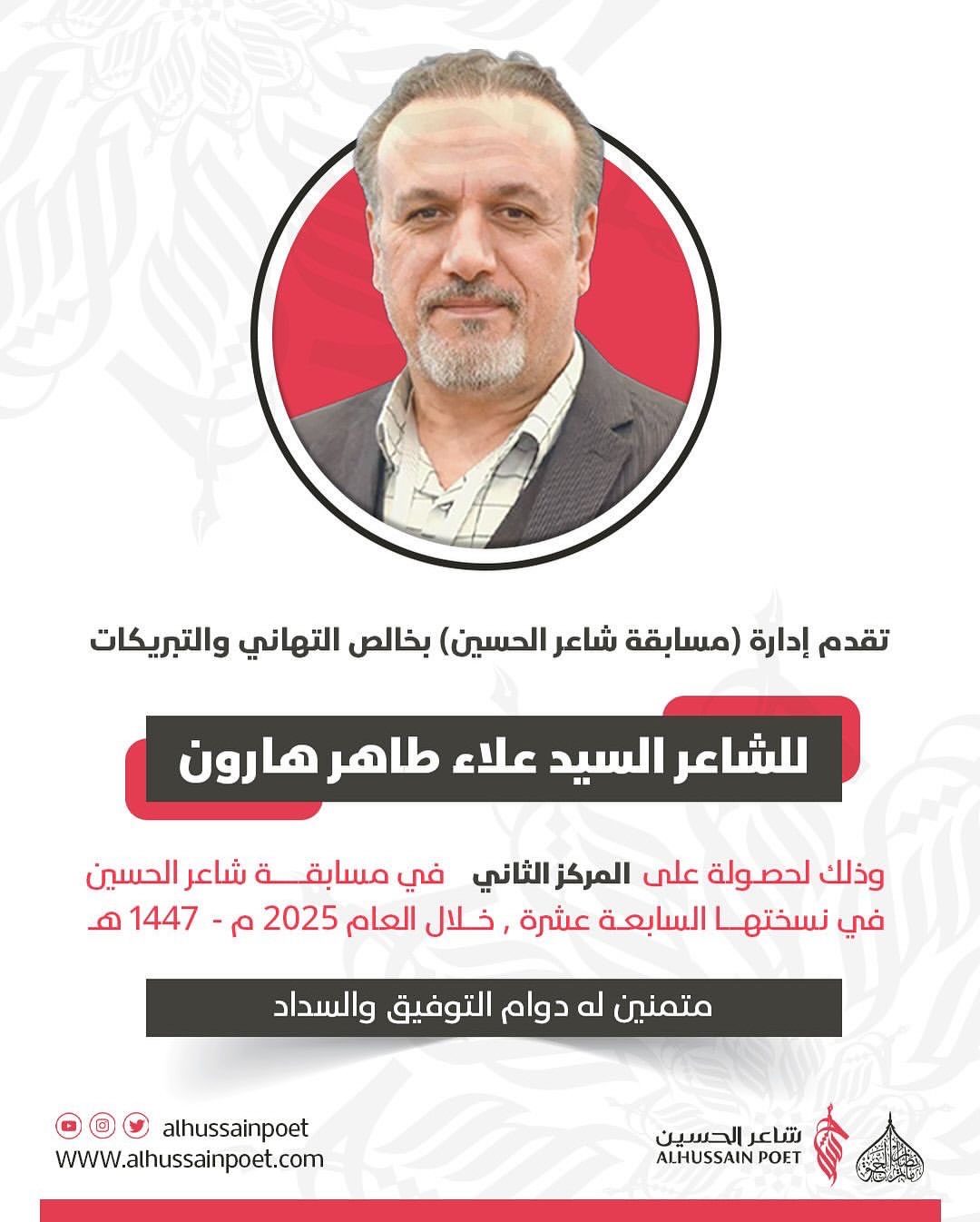 دعت اللجنة المنظمة لمسابقة شاعر الحسين جمهور القصيدة الحسينية لحضور مهرجانها الختامي الذي سينعقد في الساعة (7:45) من مساء يوم الجمعة (ليلة السبت) 29 أغسطس / آب 2025م في مأتم البصري بمنطقة البلاد القديم (مملكة البحرين)، وذلك لإلقاء القصائد الخمس المتأهلة وإعلان النتائج النهائية، وذلك تحت رعاية كريمة من سماحة العلامة السيد عبدالله الغريفي دام ظله الوارف.